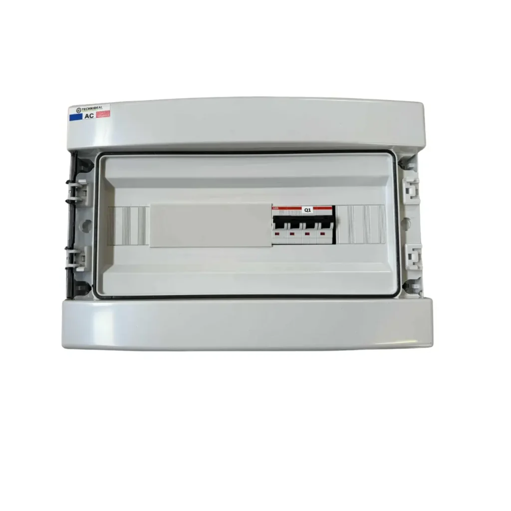 Coffret AC Triphasé retrofit NFC15-100 avec disjoncteur maison de 20A pour abonnement client 12kVA. Ce coffret est à ajouter au coffret de protection photovoltaïque.